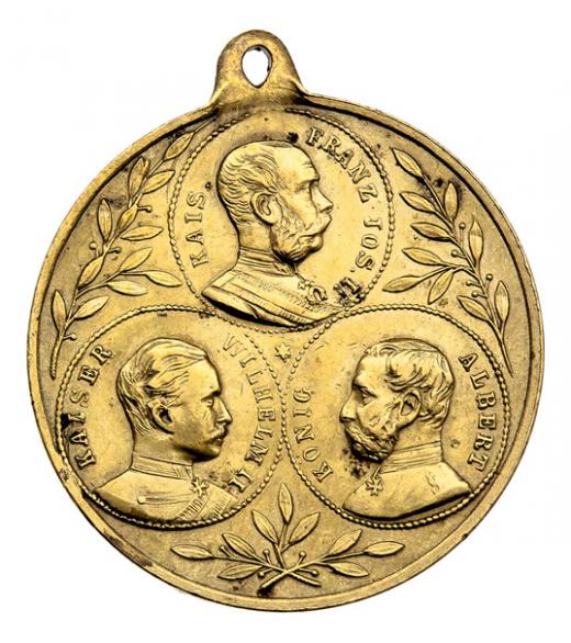 Schwarzenau 1891 - medailonky Fr.Josefa, Viléma II. a Alberta Saského, vavříny/ tři korunované znaky, opis, M-B.1891, zlac.mosaz 30 mm s původním ouškem, nep.hr.