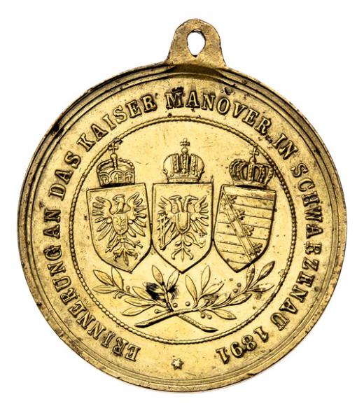 Schwarzenau 1891 - medailonky Fr.Josefa, Viléma II. a Alberta Saského, vavříny/ tři korunované znaky, opis, M-B.1891, zlac.mosaz 30 mm s původním ouškem, nep.hr.