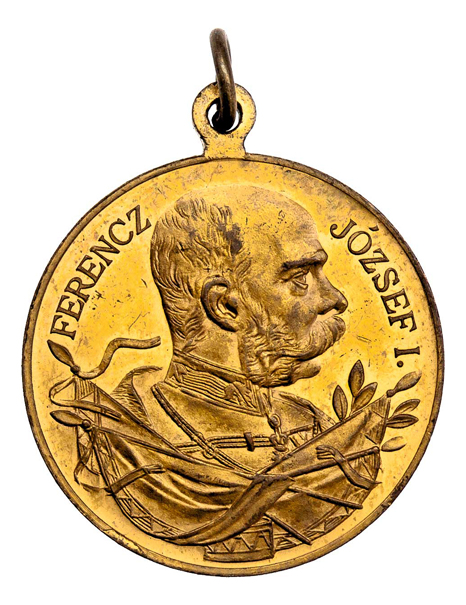 Veszprém 1908 - poprsí Fr.Josefa I. zprava, maďarský opis / 12-řádkový maďarsko-německý nápis, Nesign., M-B.77, zlac.bronz 29 mm s původním raženým ouškem