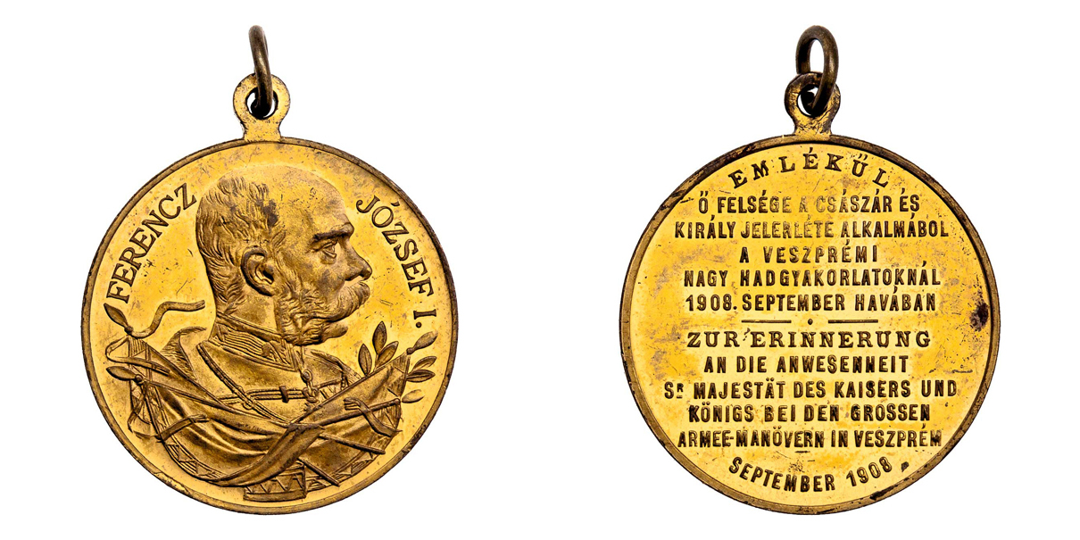 Veszprém 1908 - poprsí Fr.Josefa I. zprava, maďarský opis / 12-řádkový maďarsko-německý nápis, Nesign., M-B.77, zlac.bronz 29 mm s původním raženým ouškem