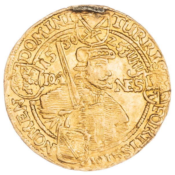 Dukát 1630 - na 100 let Augbugské konfese - Johann G. s mečem a znakem, opis / Johan I. s mečem a znaky, opis, Fr.2445, Haupt.str.52, 3.390g, m.o., zvl. R!