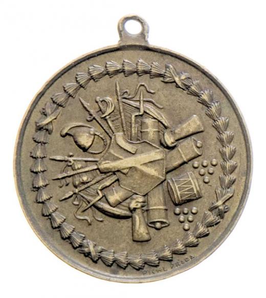 Brno 1906 - slavnost svěcení praporu veterán. spolku, zbraně a prapory ve věnci / 12-řádkový německo-český nápis, mosaz 30 mm s raženým ouškem, dr.hr., patina