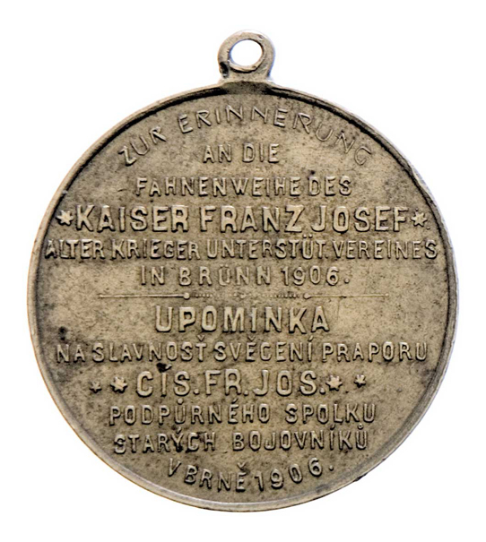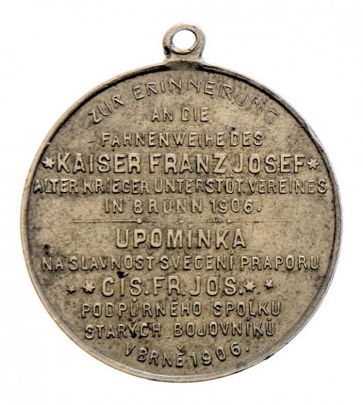 Brno 1906 - slavnost svěcení praporu veterán. spolku, zbraně a prapory ve věnci / 12-řádkový německo-český nápis, mosaz 30 mm s raženým ouškem, dr.hr., patina