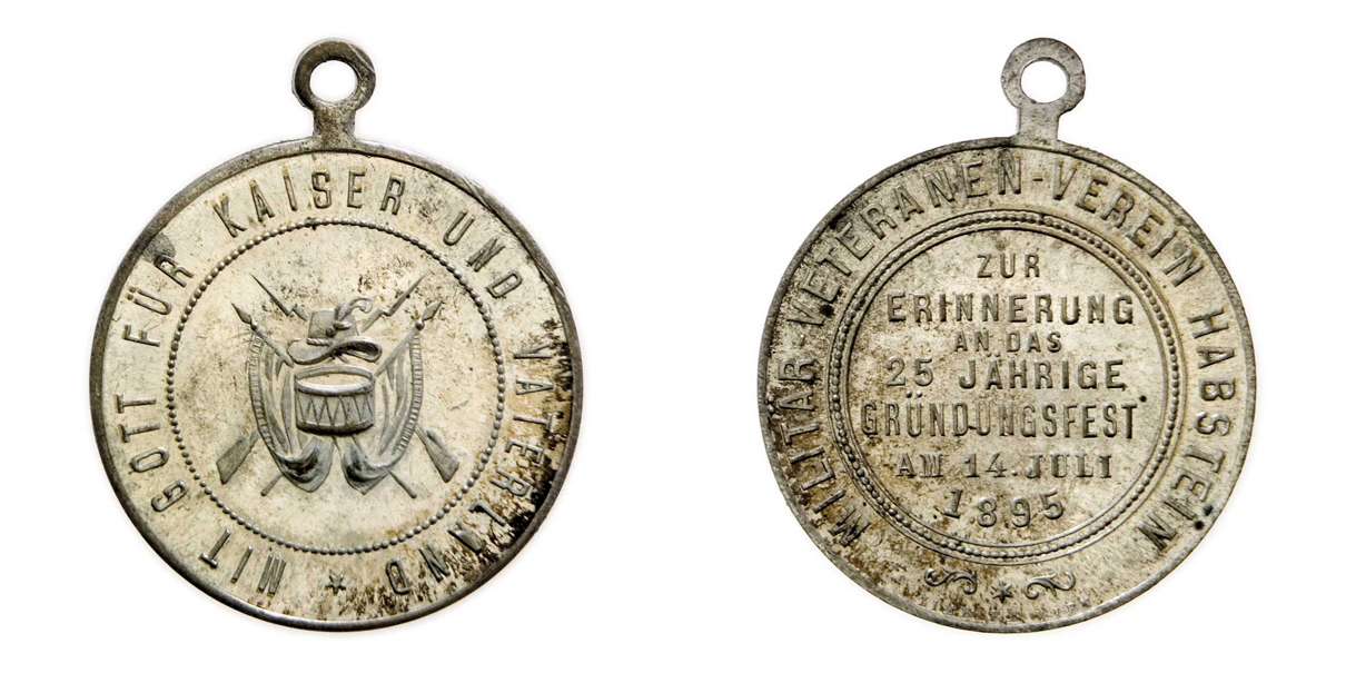 Jestřebí (Habstein) 1895 - 25 let trvání spolku, 14.7., zbraně a prapory, něm.opis / 7-řádk.něm.nápis a opis, postř.bronz 31 mm s raženým ouškem, patina