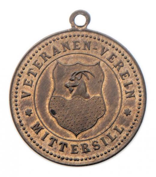 Mittersill 1899 - 25 let trvání spolku 10.9. - znak a opis / 6-řádkový nápis, Nesign., měď 28 mm s původ. raženým ouškem, nep.skvrnka, patina, téměř RR!