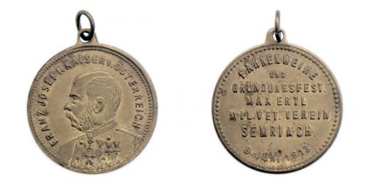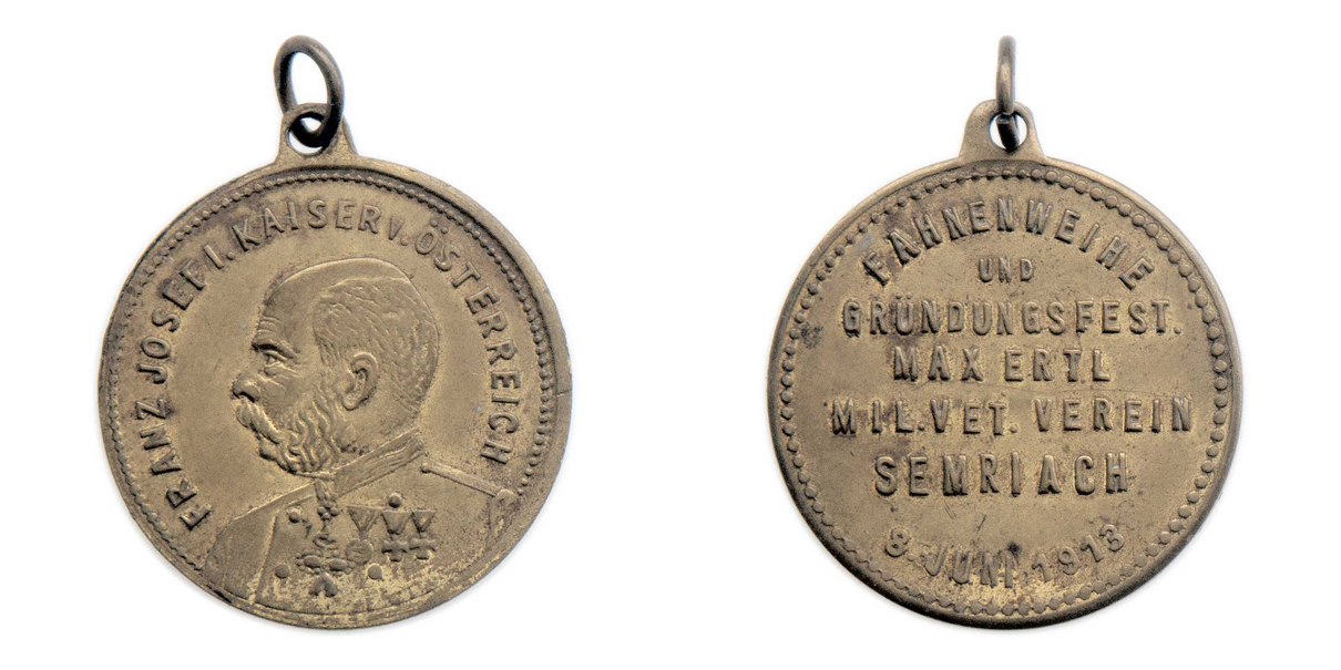 Semriach 1913 - slavnost svěcení praporu 8.6. - císař zleva, něm.opis / 7-řádk. nápis, Nesign., bronz 28 mm s původ. raženým ouškem a závěs. kroužkem, patina R!