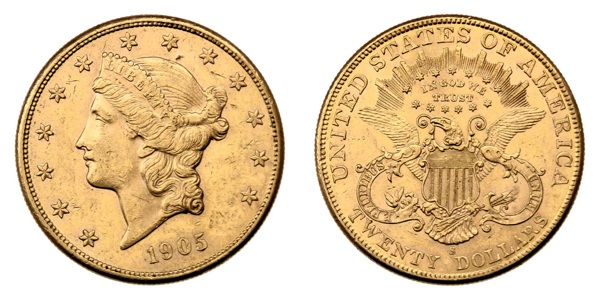 20 Dolar 1905 S - hlava Liberty, KM.74.3, 33.412g, dr.hr., nep.rysky