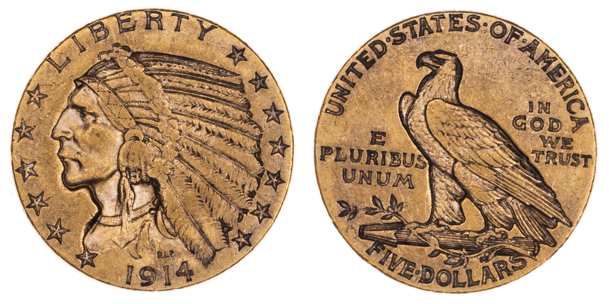 5 Dolar 1914 - hlava indiána, KM.129, 8.331g, nep.hr., dr.rysky, pěkná patina