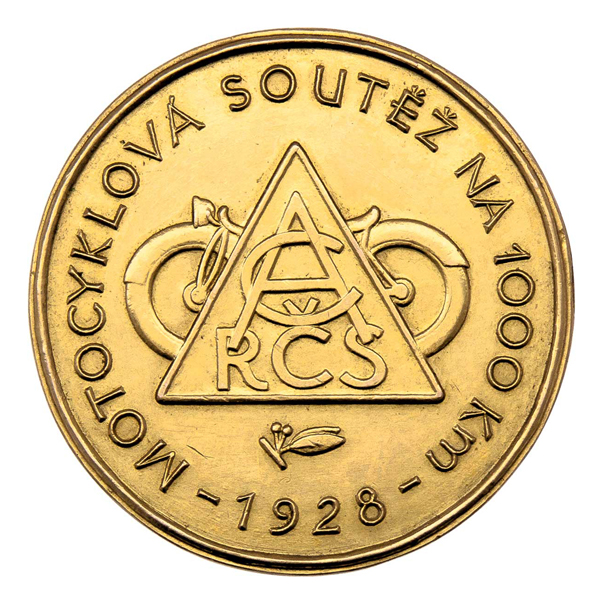 Autoklub RČS 1928 - motocyklová soutěž na 1000 km - znak, opis / emblém autoklubu, motocykl, snítka, opis Sign.TL, Punc., Au580, 37mm, 24.791g, nep.rysky R!