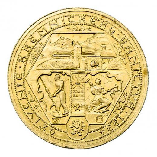 Hám - dukátová medaile na oživenie baníctva 1934 - klečící sv.Kateřina, znak Karla Roberta / důl, znak, opis, Punc., 20mm, 3.488g (pouze 288 ks), nep.hr. RR!