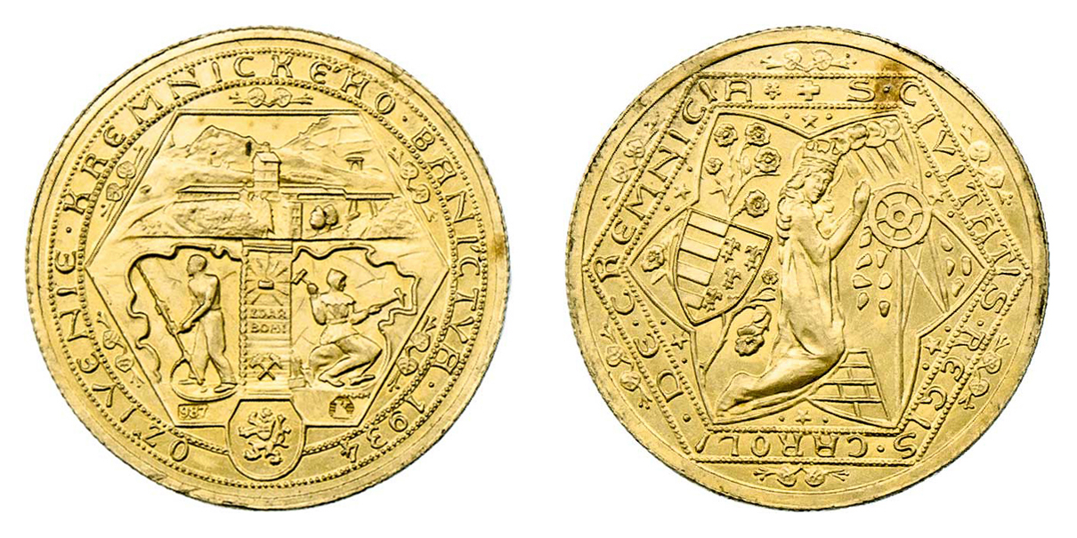 Hám - dukátová medaile na oživenie baníctva 1934 - klečící sv.Kateřina, znak Karla Roberta / důl, znak, opis, Punc., 20mm, 3.488g (pouze 288 ks), nep.hr. RR!