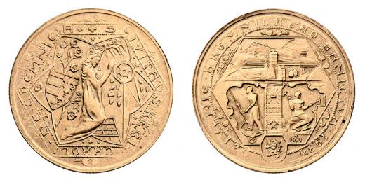 Medaile na oživenie baníctva - dukát 1934 / R1971 - klečící sv.Kateřina, znak Karla Roberta, opis / důl, znak, opis, Nesign.(Hám/Kolářský), 20mm, 3.540g R!
