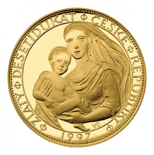 V.Oppl - "Desetidukát" (Unce) 1997 - matka s dítětem zpředu, opis / koruna a heraldické symboly českých zemí, Au999, 36mm, 31.174g, kapsle, etue, text