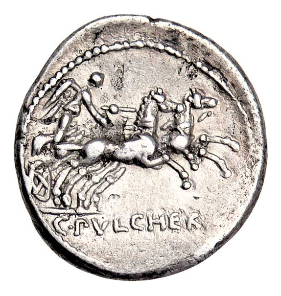 AR Denár, Hlava Romy zprava/ Victorie na bize zprava, nápis "C.PVLCHER.", Crawford.300/1, Seaby.Claudia.1, Alb.1091, mírně exc., mírně nedor., patina