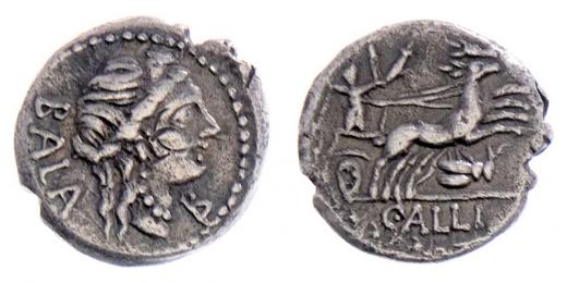 AR Denár, Hlava Diany zprava "BALA.B."/ Diana na bize tažené jeleny, kobylka, vavřínový věnec, "C.ALLI.", Crawford.336/1, Seaby.Aelia.4, Alb.1158, kontramarka