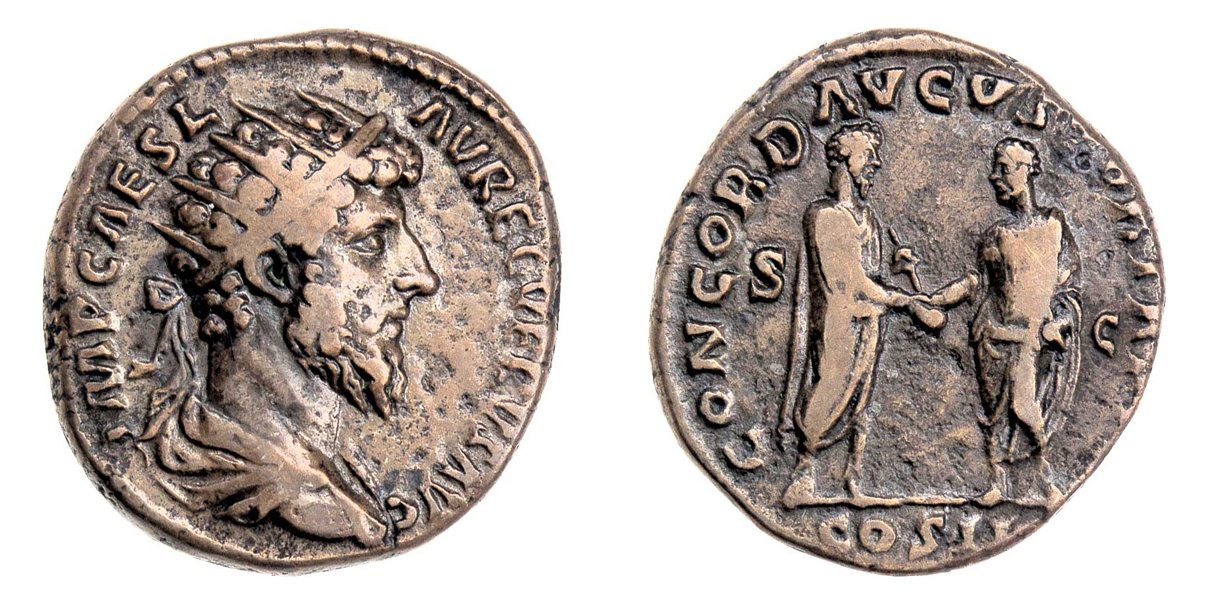 AE Dupondius, Rv:"CONCORD.AVGVSTOR.TR.P.COS.II.S.C.", stojící Marcus Aurelius a Lucius Verus, S.neuvádí, RIC.1293 - minc. Řím - ražba z roku 161, mírně kor.