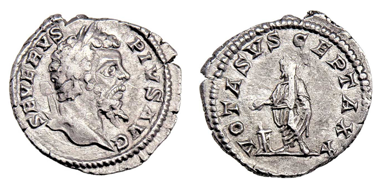 AR Denár, Rv:"VOTA.SVSCEPTA.XX.", císař u oltáře, podobný jako S.1697, RIC.308 - mincovna Řím - ražba z let 202 - 210, nepravidelný okraj střížku