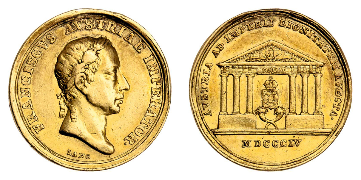 2 Dukát 1804 - na vyhlášení rakouského císařství, poprsí zprava, opis / chrám se znakem, opis, vročení, Sign.Lang, 23mm, 6.488g, m.o., dr.hr., rys., pat. RR!