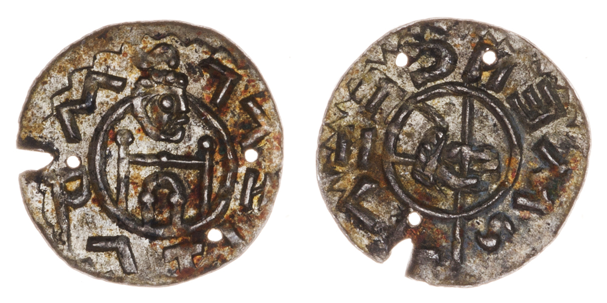 Denár, Ca.350, F.IX/3 (886) - široký trůn, 0.519g, vylomený okraj, tři drobné dírky, patina