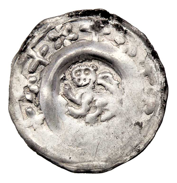 Fenik b.l. (cca 1220-1300), podobný jako Há.38, ve vnějším mezikruží šestilistá růžice, 0.717g, nep.perf.ražbou, nep.nedor., patina R!
