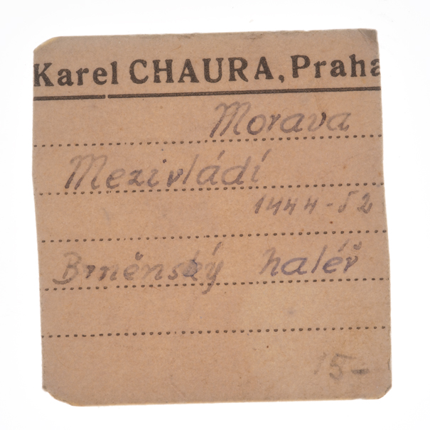 Městský peníz se šachovanou orlicí, Rad.16, SNS1.457, ražba bez čtyřrázu po roce 1452, 0.484g, nep.nedor., pěkná patina, Chaurův podložní lístek