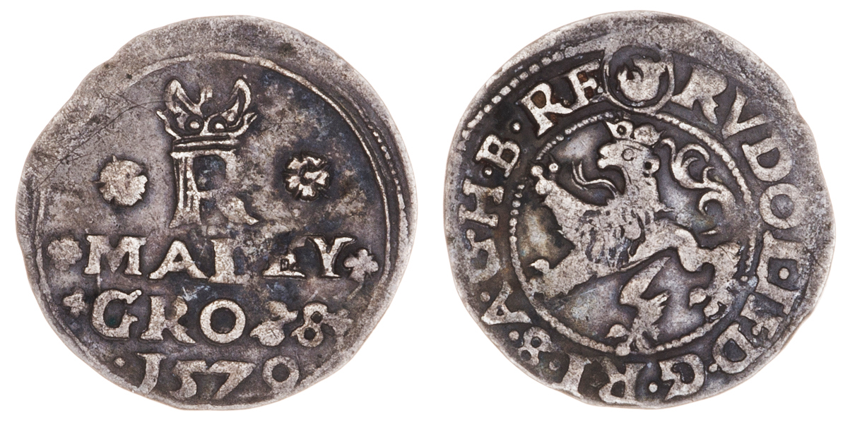 Malý groš 1579, Jáchymov-Kadner, HN.2 (opis 7b), nápis "+ MALEY +/+ GROSS +/. 1579 .", 0.963g, mírně exc., nedor., pěkná patina, podložní lístek