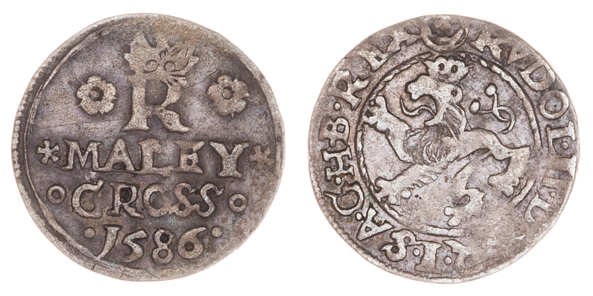 Malý groš 1586, Jáchymov-Hoffmann, HN.8a (opis 7c), nápis "* MALEY */o GROSS o/. 1586 .", 0.953g, nedor., pěkná patina