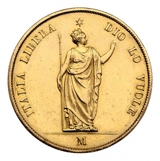 40 Lira 1848 - stojící Italie, italský opis / 3-řádk. nápis ve věnci a opis, Cr.24 (raženo pouze 5875 ks), 12.631g, nep.hr., vl.rysky, patina, téměř RR!