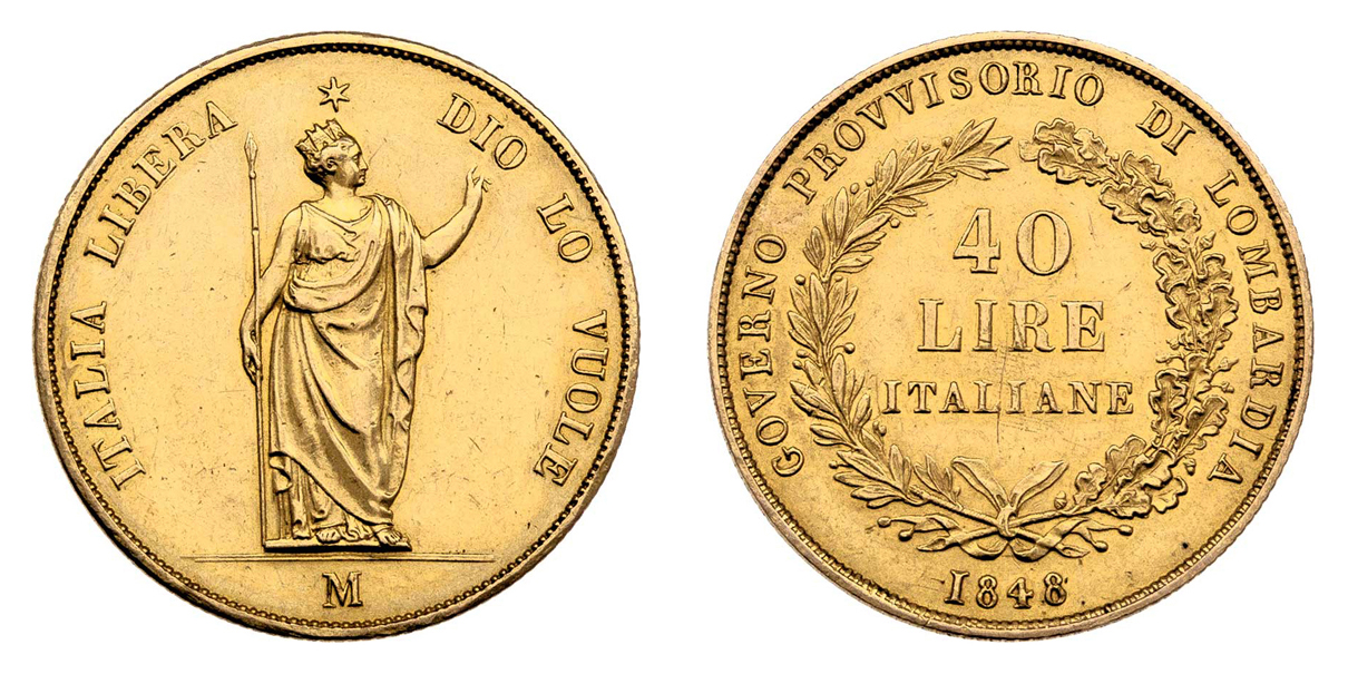 40 Lira 1848 - stojící Italie, italský opis / 3-řádk. nápis ve věnci a opis, Cr.24 (raženo pouze 5875 ks), 12.631g, nep.hr., vl.rysky, patina, téměř RR!