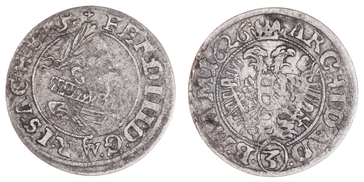 3 Krejcar 1626, Brno-Wohnsiedler, MKČ.884, podobný jako MKČ.537, 1.547g, patina