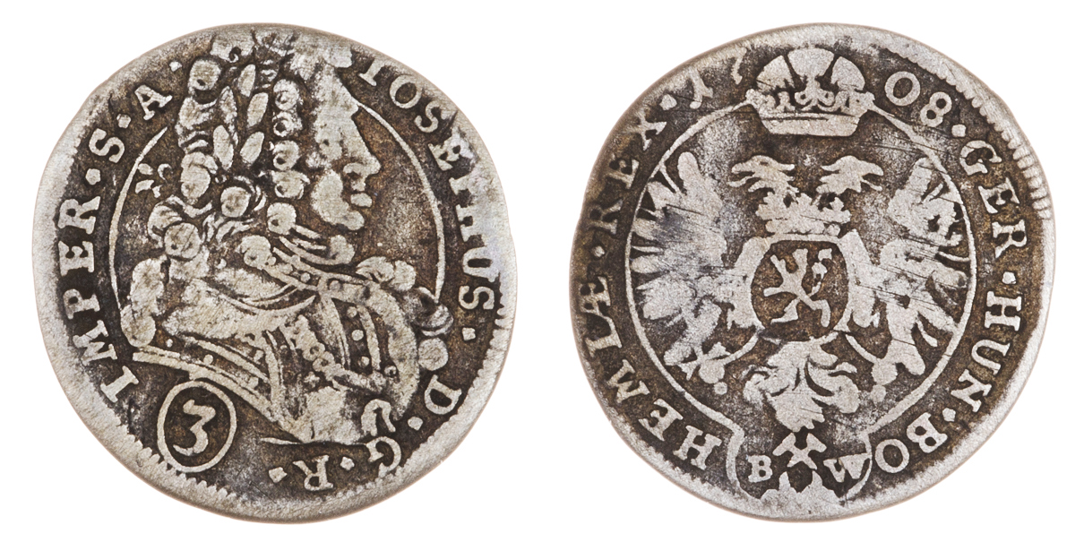 3 Krejcar 1708, K.Hora-Wohnsiedler, J.3b/3a-hybridní, MKČ.1731, 1.491g, nedor., patina R!