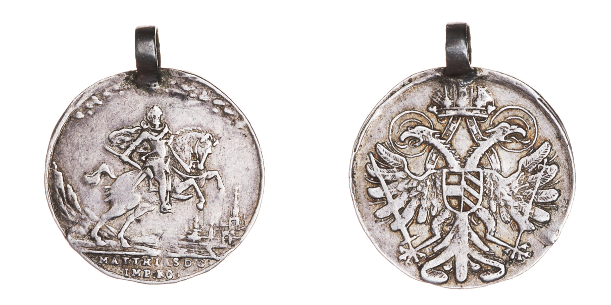 Nesign. -jeton na volbu ve Frankfurtu, 13.6.1612 Císař na koni zprava, nápis / korunov. císařský orel, Ag 32mm, 8.752g, Nov.F.9b, dobové ouško, patina