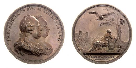 Keiserswert - upevnění hranice v Sedmihradech 1762 - dvojportrét zprava, opis / sedící Dacia, císař.orel, opevnění a nápis, měď 59mm, M.1903, nep.hr., dr.rys.