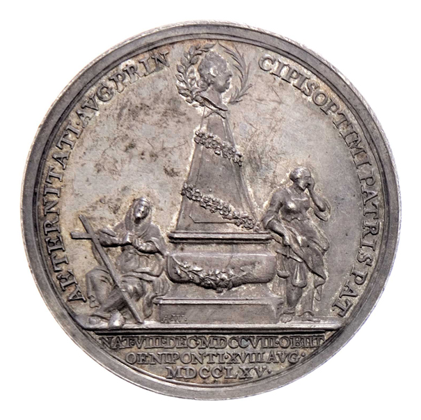 Widemann - AR úmrtní medaile 1765 - poprsí zprava opis / náhrobek, dvě truchlící postavy, opis a nápis, Sign., 45mm, 34.488g, M.1948, H.2799, MMT.180, patina
