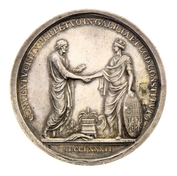 Wirt - vydání ústavy Haliče a Lodoměřska 1782 - poprsí zprava, opis/ senátor a Galicie, modius, opis, Sign., Ag 43 mm, 26.145g, M.2150, dr.hr., nep.rys. R!