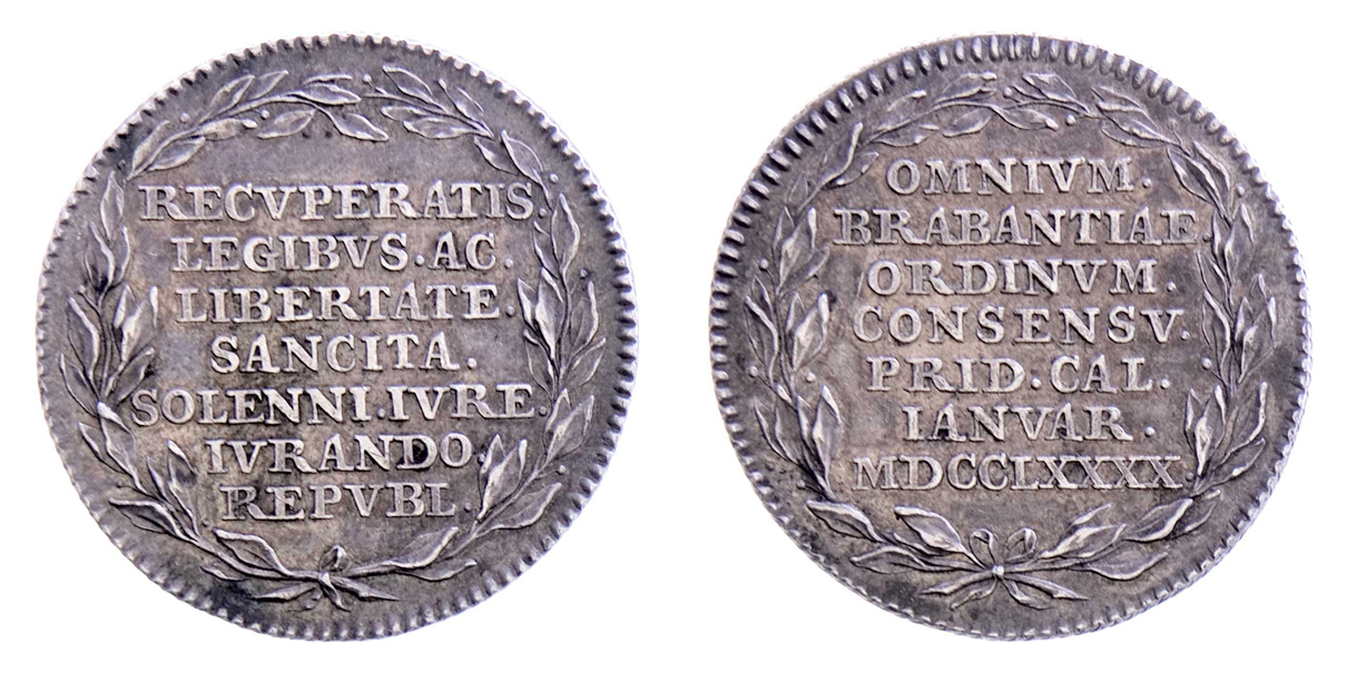 Brabantsko - AR jeton na vyhlášení samostatnosti 1790 - sedmiřádkový nápis ve věnci / sedmiřádkový nápis ve věnci, Ag 34mm, 13.084g, FW.II.11369 (AE), pat., tém.