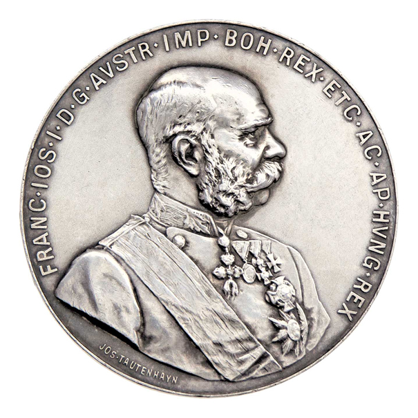 Tautenhayn - medaile na 50 let vlády 1898 - poprsí zprava, opis / Austria sedící na trůnu, putti s rohem hojnosti, opis, Sign., Punc., 37.881g, patina, téměř