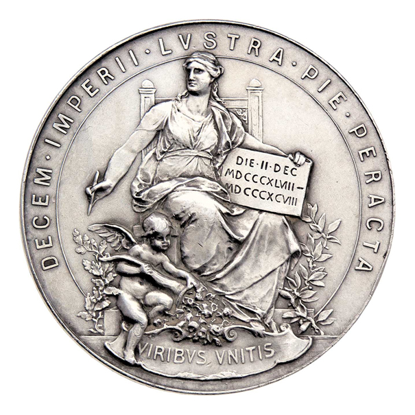 Tautenhayn - medaile na 50 let vlády 1898 - poprsí zprava, opis / Austria sedící na trůnu, putti s rohem hojnosti, opis, Sign., Punc., 37.881g, patina, téměř