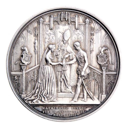 Lange - AR medaile na svatbu ve Vídni 24.4.1854 - dvojportrét zprava, opis / svatební scéna, nápis, Sign., 55mm, 87.463g, M.2675, H.3764, nep.rysky, pat.