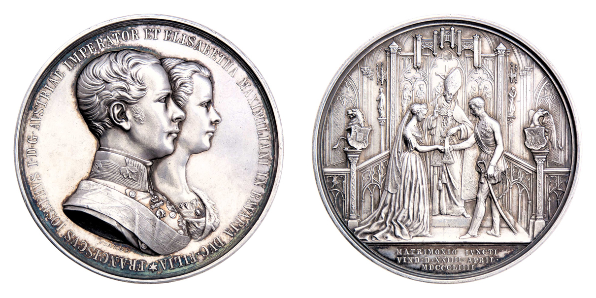 Lange - AR medaile na svatbu ve Vídni 24.4.1854 - dvojportrét zprava, opis / svatební scéna, nápis, Sign., 55mm, 87.463g, M.2675, H.3764, nep.rysky, pat.