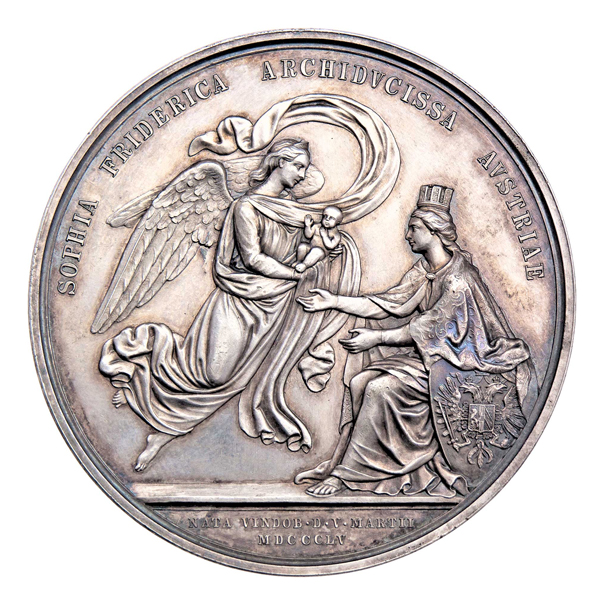 Lange - AR medaile na narození dcery Sofie 5.3.1855 - dvojportrét zprava, opis/ anděl předává dítě Austrii, písmo, Ag 56mm, 87.395g, H.3767, nep.rysky, patina