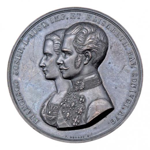 Broggi a Cebeda - medaile na návštěvu Milána 1857 - dvojportrét zleva, latinský opis / triufální brána, 5-řádk.nápis, Sign., měď 55 mm, Haus.633, téměř R!