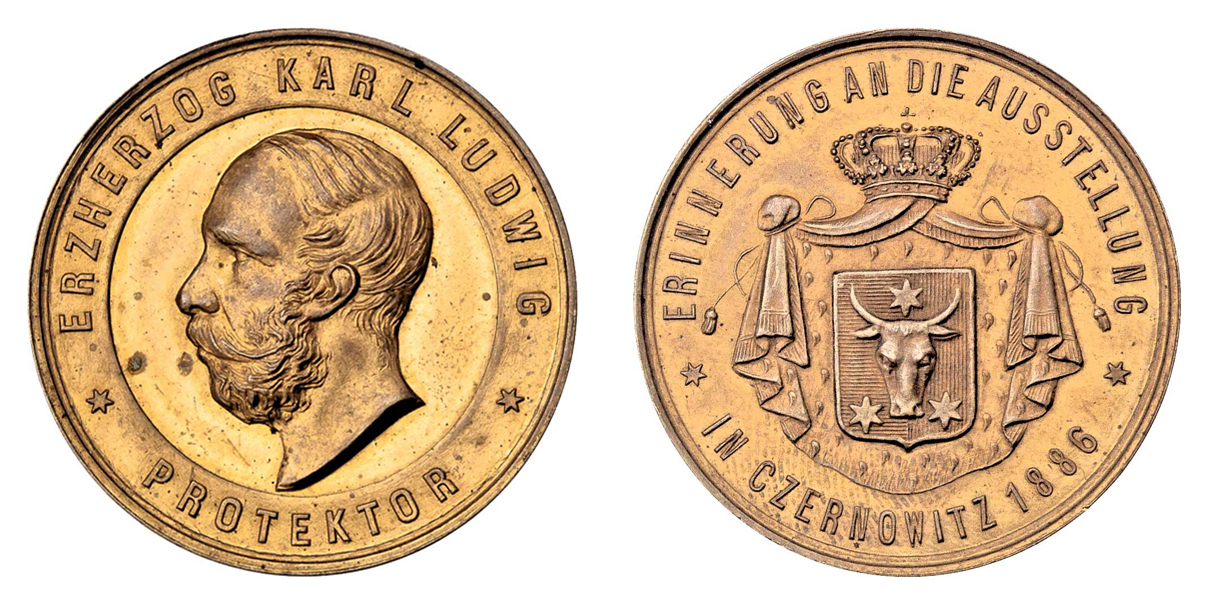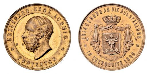Upomínka na výstavu v Černovcích 1886 - poprsí zleva, opis / znak na plášti pod korunou, opis, Nesign., zlacený bronz 30 mm, skvrnky, patina