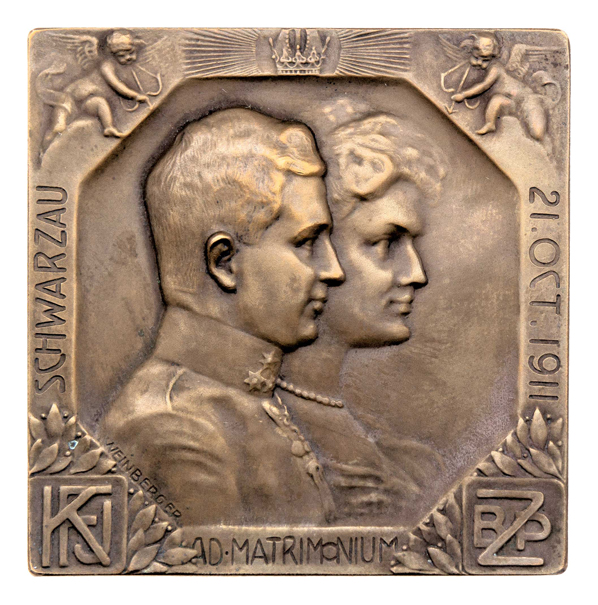 Weinberger - svatební plaketa 21.X.1911 - dvojportrét zprava, koruna, andílci, monogramy a opis, Sign., jednostranný patinovaný bronz 60x60 mm, téměř R!