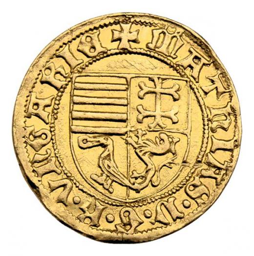 Dukát (1470) n-"kladívka", Nagybanya - městská ražba, svatý Ladislav, opis / čtyřdílný znak, opis, Fr.20b, Husz.674, Pohl.K1-22, 3.471g, dr.hr., patina, téměř