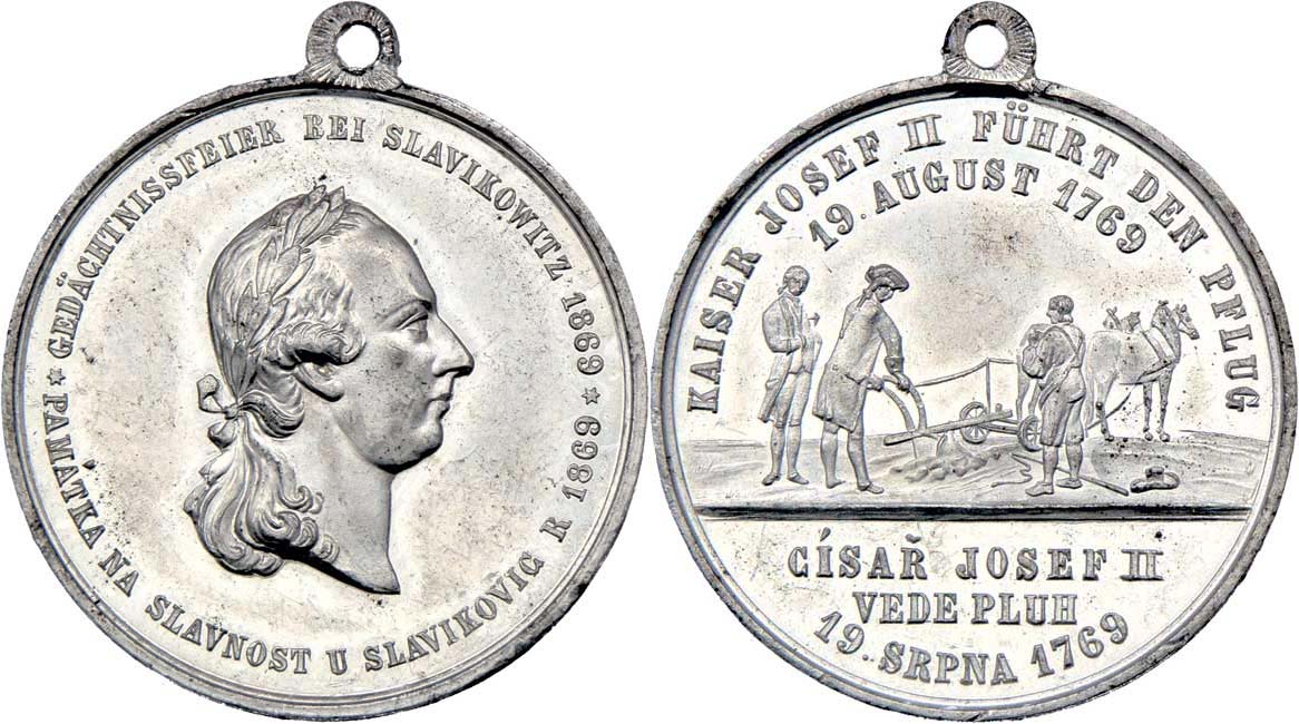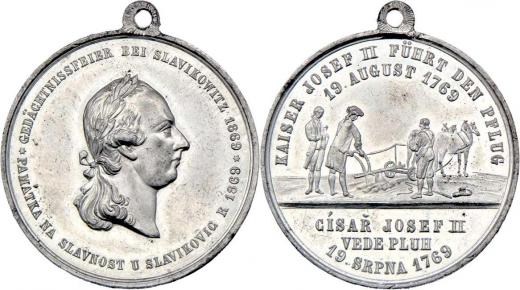 Sn medaile na 100 let císařovy orby u Slavíkovic 1869 - hlava zprava, opis / císař vede pluh, dvojitý opis a nápis, Nesign., 32mm s původním ouškem, pat., téměř