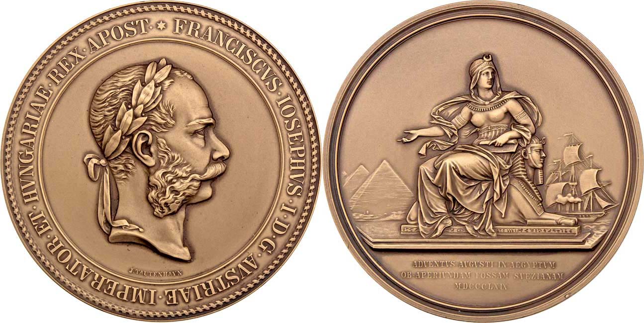 Tautenhayn - návštěva Suezského průplavu 1869 (1915) - portrét zprava, opis / Alexandrie sedící na Sfinze, pyramidy, loď, nápis, Sign., patinovaný bronz 71 mm