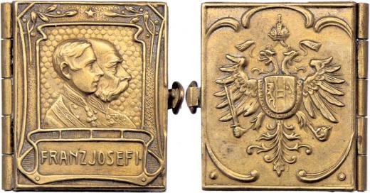 Nesign. - kovové pouzdro ve tvaru knížky s portréty císaře v různém věku a společným portrétem arcivévodů Karla Frant. Josefa a Ferdinanda Karla, velmi dobře