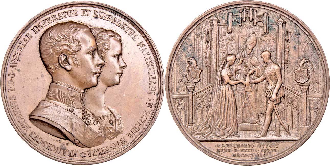 Lange - AE medaile na svatbu ve Vídni 24.4.1854 - dvojportrét zprava, opis / svatební scéna, nápis, 55mm, 79.450g, M.2675(AR), H.3764(AR), dr.rys., pat.