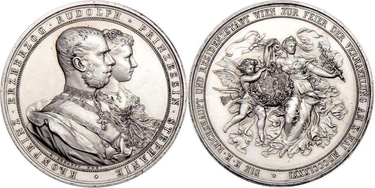 Scharff - nikl. medaile na památku sňatku 10.5.1881 - dvojportrét zprava, opis / Venuše a Eros nesou erby manželů ve věnci, opis, Sign., 50mm, Don.3251, patina